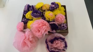 本日の午前中のカリキュラムはクラフト・・ お花紙で、カラフルなお花をたくさん製作して頂きました。 皆さん、最初は苦戦している場面もありましたが、慣れてくると動きもスピーディーに♪ 手先の訓練、集中力UPに最適ですね。 こんな素敵な花飾りが出来ました♪ 来週の体験会の教室飾りに使用したいと思います(*^-^*)