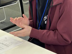 本日はスタッフも利用者さんにご一緒させていただき、ウォーミングアップやハンドクラップの鳴らし方等ご説明をさせて頂き、毎回皆さんが楽しみにしているテンポ当てクイズ等も行い、こちらを絡めたフレーズの発音にチャレンジ頂きました!