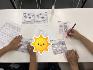 「一緒に探そう以心伝心」に取り組み 間違い探しを2人1組で行い左・右の間違い探しをそれぞれで持っていただき口頭でお互い話しながら間違いを見つけるというカリキュラム内容になっております。