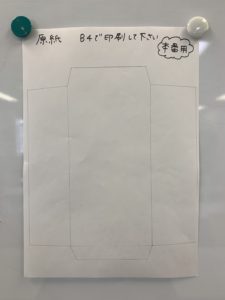 B4用紙にプリントアウトした原本を切り抜き、要所要所を糊付けしながら封筒に仕上げていきます。
