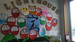 今月は愉快なだるまたちがライトハウスの玄関から