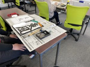 瞑想や縦棒、横棒、左払い、右払いのをウオーミングアップを春日部では行っています。